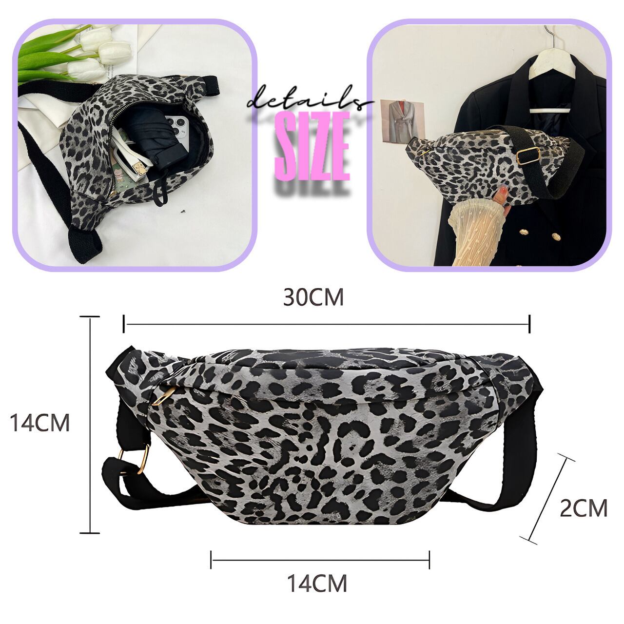 ・サイズ: 本体サイズ約上横幅30cm ×下横幅14cm× 高さ14cm × 奥行き2cm(ウエストストラップ調整可能)